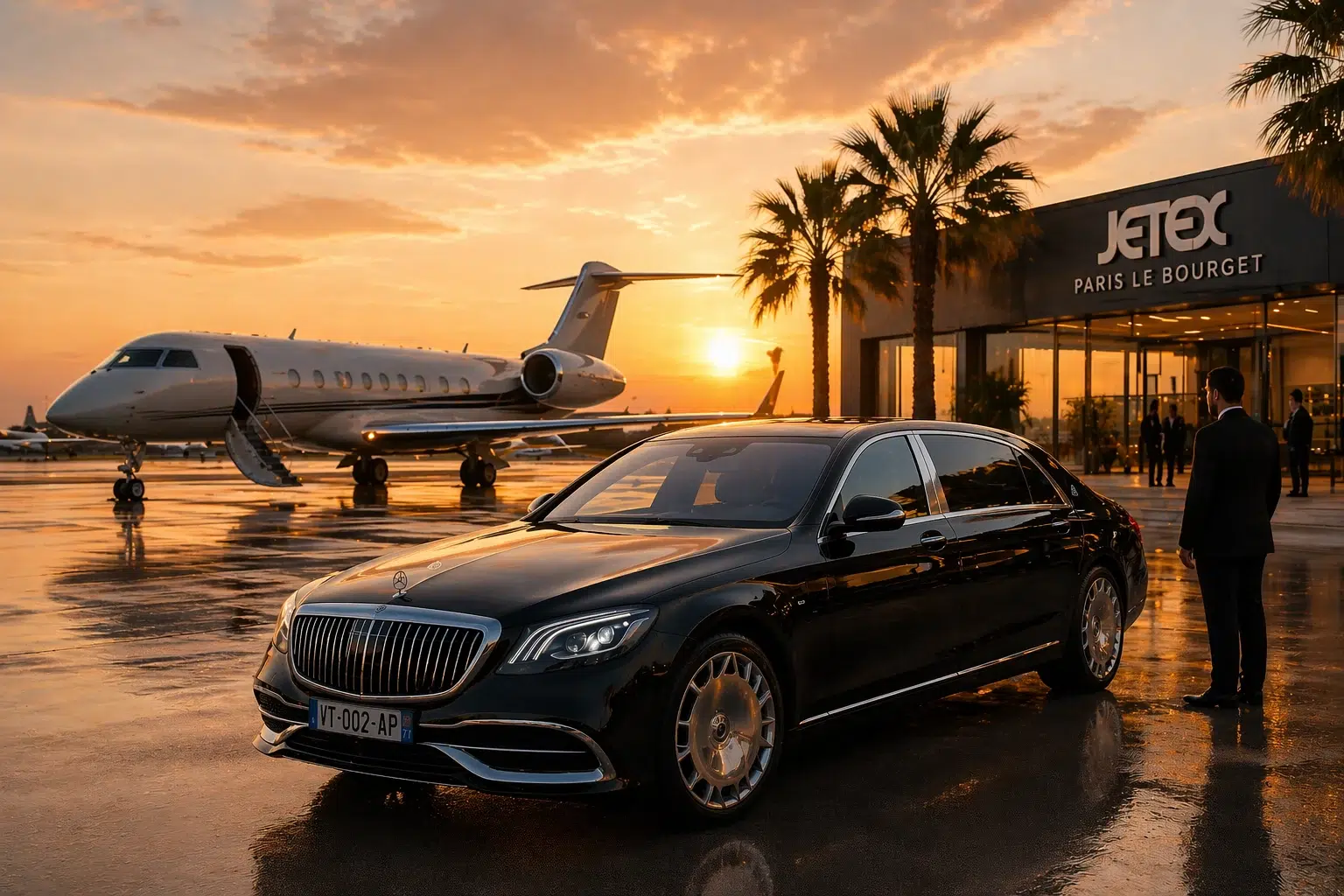Coordination directe avec le FBO Jetex pour un accueil ultra-premium. Mercedes Maybach disponible sur demande, prise en charge bagages dès la sortie du salon VIP.